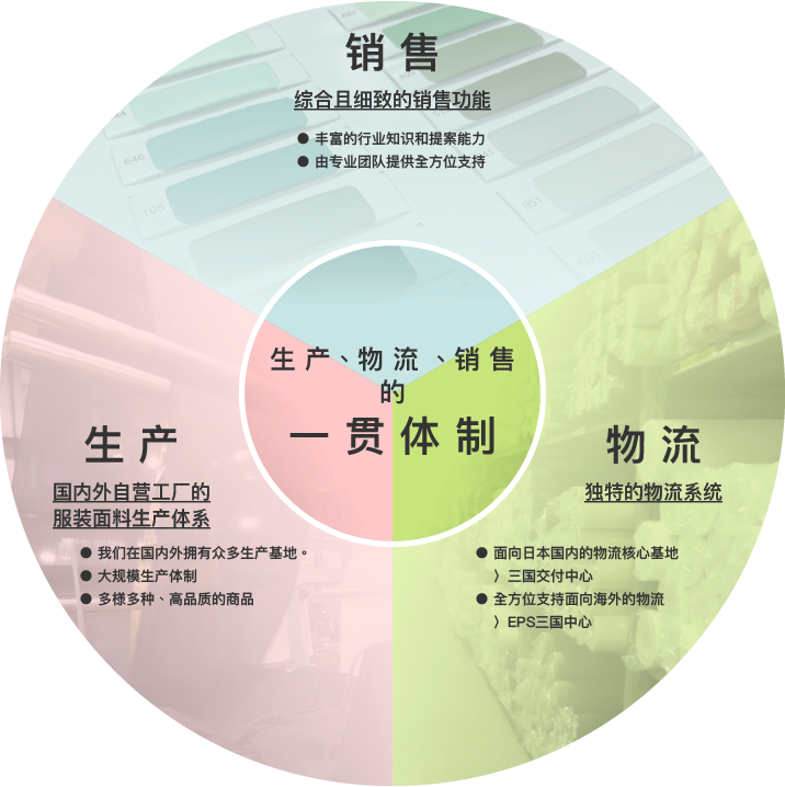 - 由位于国内外的自有工厂形成的服饰衣料物料的生产体制